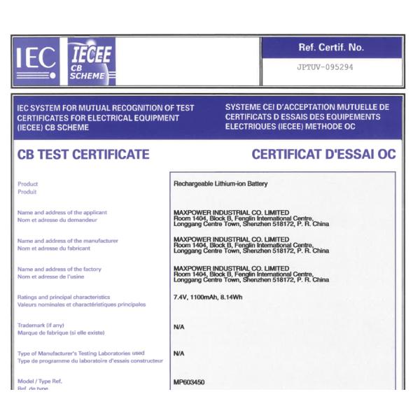 7.4V lipolymer battery Pack CB TUV Certificate :